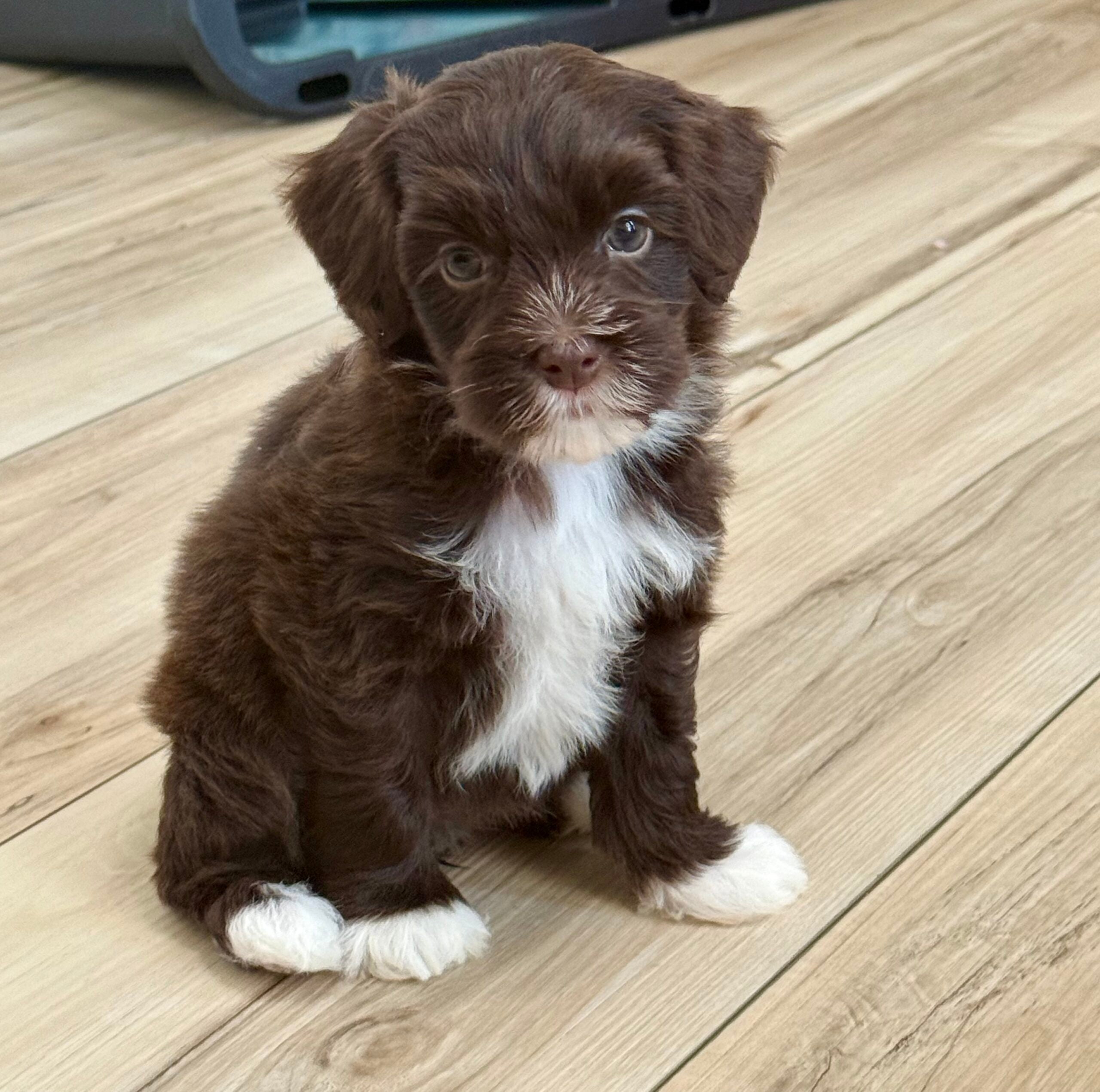Boo is a MICRO MINI Labradoodle and one delicious chocolate cutie, with just a splash of white and a heart full of love! She’s expected to be under 15 pounds full-grown—small enough to fly right under the seat in front of you and big enough in personality to turn every head along the way. I fell so in love with this litter I bought her sister Baby too!