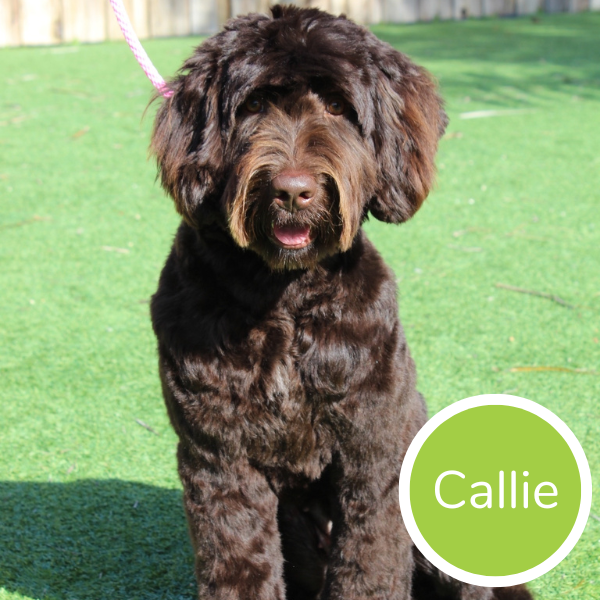 Callie the Labradoodle: Born 4/10/22 This gorgeous girl has a sumptuous chocolate-colored coat. She is about 40 lbs. She has a chenille, soft, wavy fleece, non-shedding coat. She is very sweet and truly vested in knowing what you feel, think and want from her. She will be your faithful companion. VERY kind and gets along fantastically with other dogs. She is athletic and able to go as long and as far as you want to go, but can just hang with you too! Her breeder opted to NOT breed her and let me have first option on her. I saw the videos of her and fell in love. Her lines are amazing from a stellar breeder, Brookside Labradoodles! Both parents have amazing temperaments & great health and lines that have produced amazing dogs. I love it when the generations gather at APBC and I can’t wait to see who she will train up to be. I love her curiosity, eye contact, her willingness to explore and LOVES snuggles!
